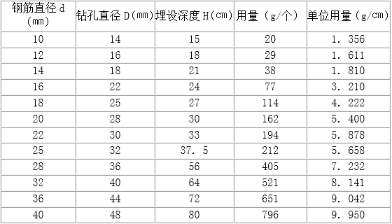注:固料比重:1.8 g/㎝3,錨固料的計算用量與實際用量的誤差在于:打孔直徑與深度的差別。